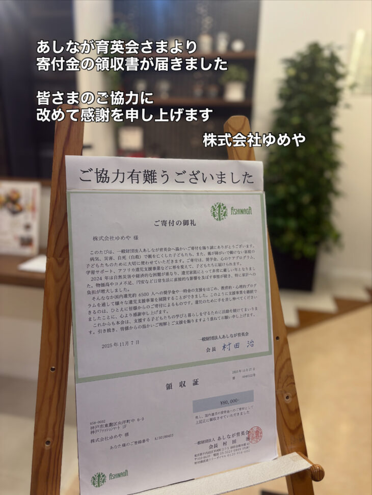 あしなが育英会さまより寄付金の領収書が届きました。皆様のご協力に心より感謝と御礼を申し上げます。