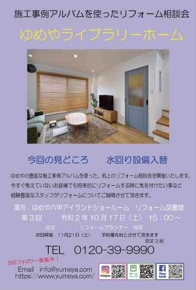 | 毎回大好評のらいぶらりぃーすうぃーつの姉妹企画!? 【ゆめやライブラリーホーム】の10月度のご案内です😊 いよいよ第3回目を迎える好評企画は!! 《水回り設備入替》のお話を、ゆめやの施工事例アルバムなどを使いながら、楽しく分かりやすくご説明させて頂きます📚 キッチン、トイレ、お風呂、洗面所・・・ 多分、間違いなく、家の中でも、とても使用頻度の高い場所🏠 だからこそ、普段聞けないことも聞いてみたい、相談してみたいと思いませんか?😊😊😊 堅苦しさはぜんぜんありませんっ(・∀・)イイネ!! リフォームの予定がある方、まだまだ先の方、全く予定もないけど興味はあるわぁ~の方!! どなたさまでも大歓迎です🎶 素朴な疑問をゆめやスタッフにぶつけてくださいっ😊 日時:10月17日(土) 15:00~ 場所:ゆめや六甲アイランド店(リフォーム図書館) 限定3組様となっておりますが、気になられた方はお気軽にお問合せください☎ 皆さまにお会いできますこと、楽しみにしております!! |