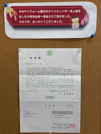 | ゆめやでは、春と秋のリフォーム祭りイベントで、端材やサンプル品のクロス・カーテン・タイルなどを100円均一でチャリティバザーとして販売しているのをご存知ですか?😊 毎回、たくさんの方々からチャリティバザーへのご協力を頂き、先日の《秋のリフォーム縁日》では、なんと『32,148円』の売上がありました! その売上金のすべては、子どもたちを支える民間非営利団体【あしなが育英会様】へ寄付をさせて頂いております。 本日、あしなが育英会様よりお礼状が届きましたので、皆さまへもお知らせ致します。 まだまだ色々な事情で思うように生活が出来ていない子どもたちも多いと思います。 少しでも、そんな子どもたちの笑顔が増えると嬉しいなと思います😊 ご協力を頂きましたみなさま、本当にありがとうございました。 ゆめや全社員一同、心より御礼申し上げます。 |