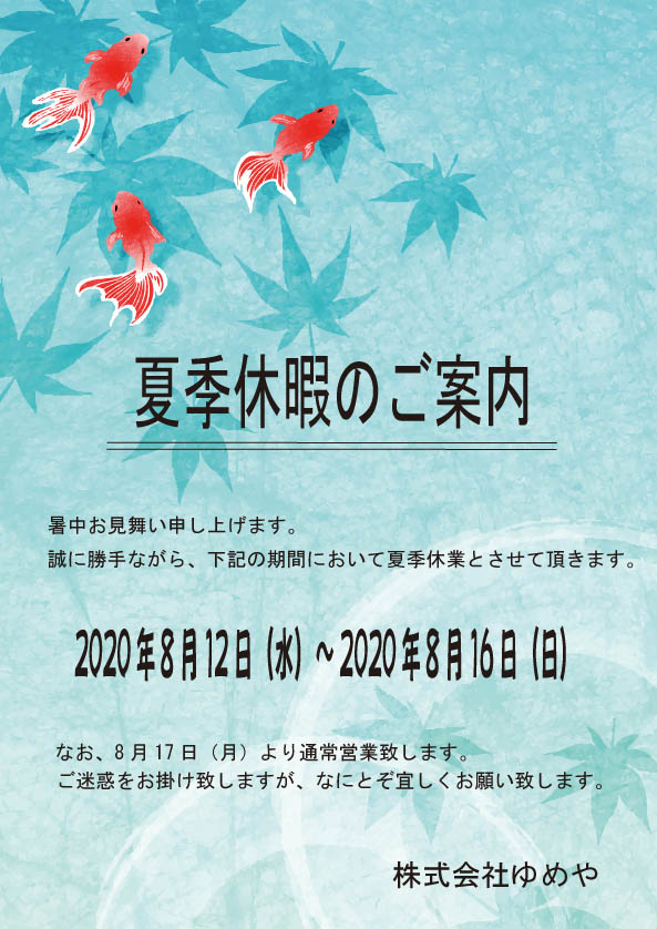 | 暑中お見舞い申し上げます。 平素は格別のご高配を賜り有難うございます。 弊社では、下記日程において夏季休暇とさせて頂きます。 ご迷惑をお掛け致しますが、なにとぞ宜しくお願い申し上げます。 【夏季休暇】2020年8月12日(水)~2020年8月16日(日) なお、8月17日より通常営業いたします。 みなさま、夏バテに気を付けて、どうぞ素敵な夏をお過ごしくださいませ。 |