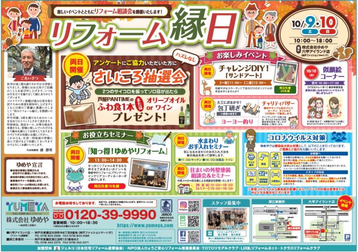 - リフォーム縁日を開催いたします!楽しいイベントとともに、両日とも『お役立ちセミナー』や『水廻りお手入れセミナー』などリフォームに役立つイベントとなっております。 アンケートにご協力いただいた方にさいころ抽選会(ハズレなし!)もご用意しております。お気軽にお立ち寄りください。