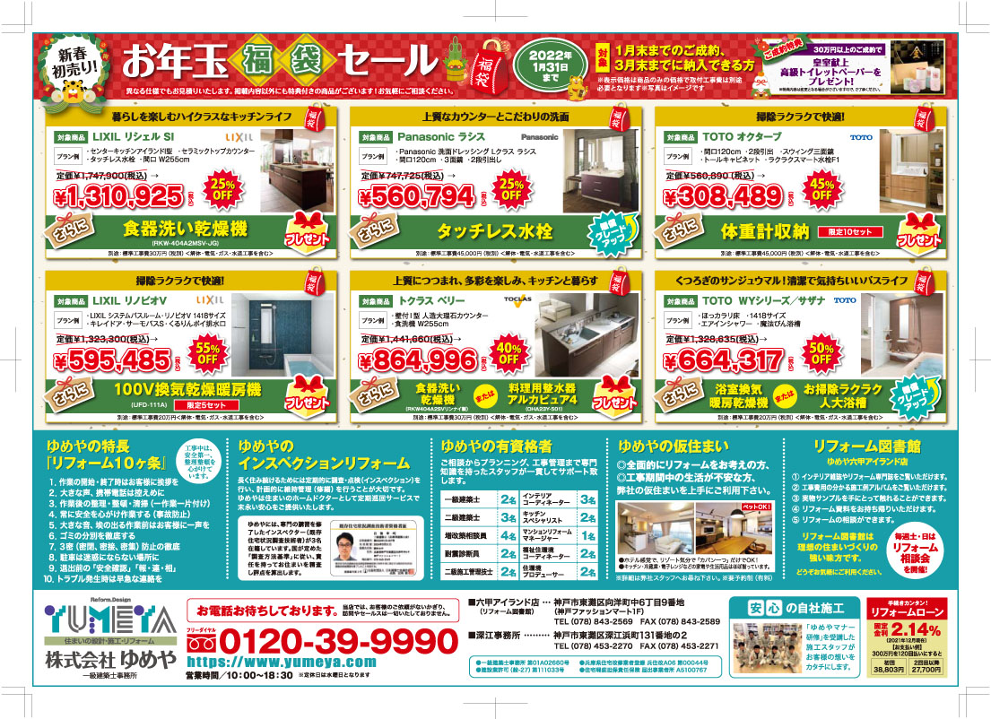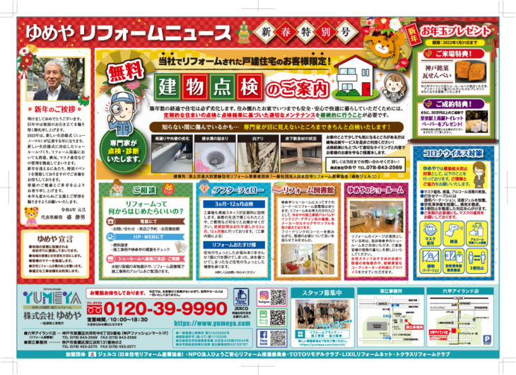 資料請求 無料相談 HOMEイベント・チラシイベント🎍ゆめやリフォームニュース 新春特別号🎍 🎍ゆめやリフォームニュース 新春特別号🎍(終了しました) 一言 毎年恒例のご来場特典「ゆめや瓦せんべい」もご用意してお待ちしております!(アンケートにご協力を頂いた方にプレゼント!なくなり次第終了となります) イベント・チラシ一覧はこちら ゆめやについて 会社案内代表挨拶会社概要ゆめやの誓い施工エリア 選ばれる理由 スタッフ紹介 採用情報 施工事例 施工事例一覧 寝室 戸建て マンション LDK 和室 茶室 断熱 性能向上 大規模 受賞作品 その他部位別 玄関 収納 キッチン お風呂 洗面所 トイレ 外壁・屋根 エクステリア お客様の声 お客様の声一覧 お役立ち情報 性能向上リフォームについて 茶室リフォームについて ショールーム ゆめやの仮住まい イベント・チラシ情報 季刊誌Cocoti リフォームかし保険 リノベーションの流れ ブログ 採用情報 住宅省エネ2026キャンペーン 先進的窓リノベ2026事業 みらいエコ住宅2026事業 給湯省エネ2026事業 お問い合わせ お問い合わせ 資料請求 リフォームについて詳しくはこちら TOPにもどる
