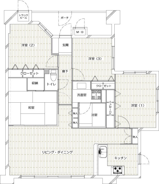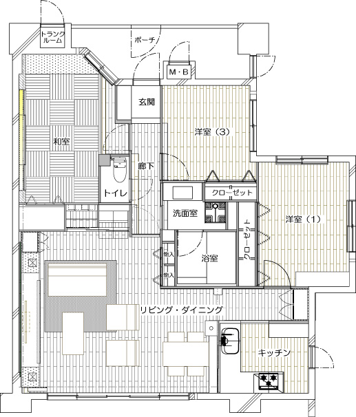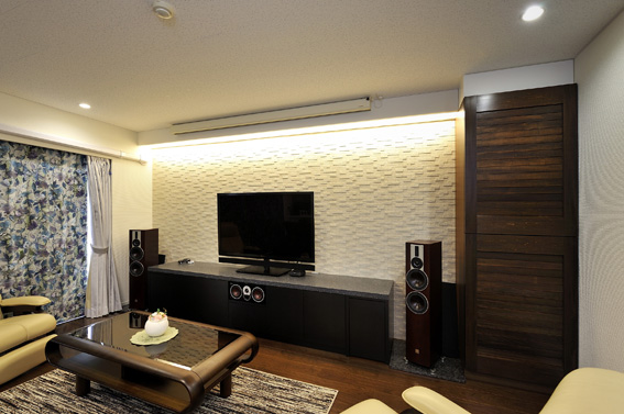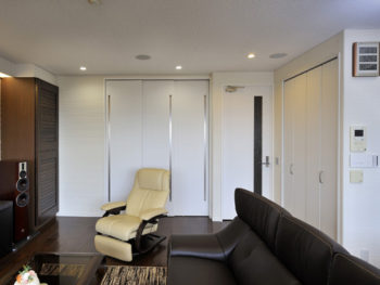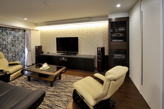 | プラン決定のポイント工夫 | ご夫妻の暮らしに合うように間取りを変更するとともに、ご希望をうかがいながら収納家具を造作し、本格仕様のシアタースペースを生み出しました。また、吸音、防臭のためにエコカラットを採用したほか、寝室として使われているお部屋や和室は二重窓とし、断熱性が上がるプランに。 |
