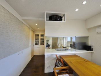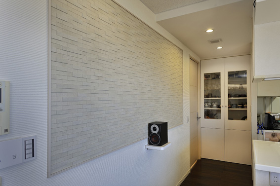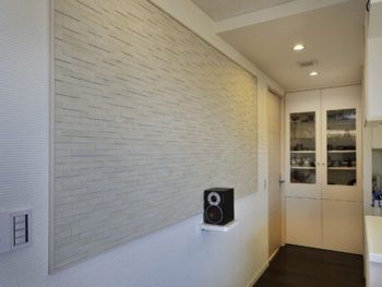 【ダイニング~キッチン】既存収納は、おしゃれなオリジナルの扉に変更したほか、壁面にエコカラットを採用することで、吸音性・デザイン性も向上させた。スピーカー置きの棚は、取り外し出来ます。