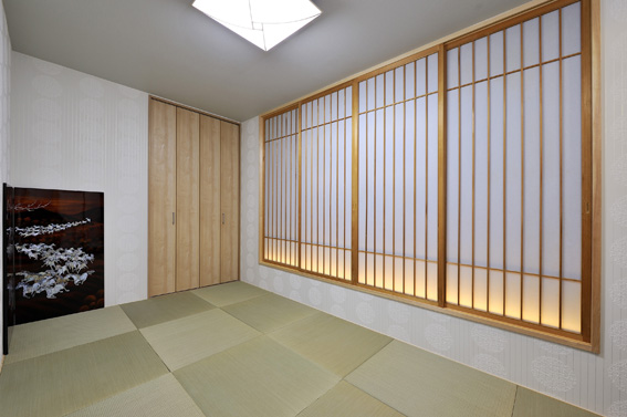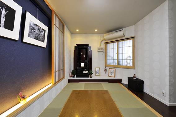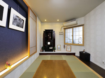 【和室】北側の洋室をなくして新しく設けた広くてスタイリッシュな和室。モダンな琉球風の半畳ダタミを採用し、お仏壇の台もオーダーにより作成。お子様たちの帰省時には、便利なくつろぎの一室に。