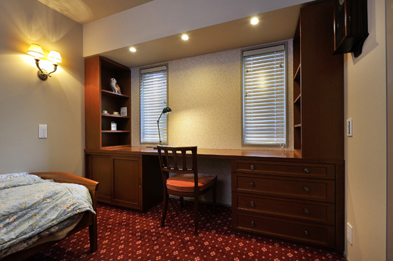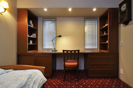 | お客様のご要望 | ご主人様の寝室にデスクと収納をご希望されました。お手持ちのアンティークなブラケットと椅子に合わせてヨーロッパのクラシックスタイルにと伺いました。 |