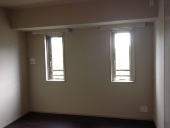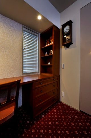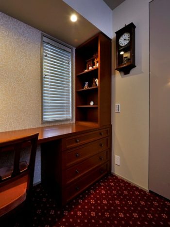 窓を活かした、モダンクラシックな書斎風に仕上がりました。2つの窓にはウッドブラインドを設置しました。 ウッドブラインド:ベネウッドブラインド/TOSO