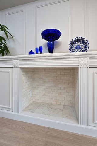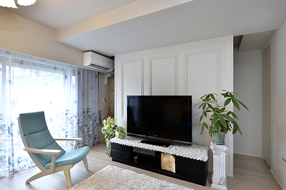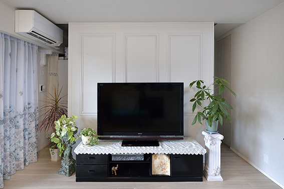 【リビング】部屋の中央にマントルピースと収納をつくり、壁面にはモールディングを取り付けることでがらっとイメージが変わり、さっぱりしたお部屋がデコラティブな空間になりました。