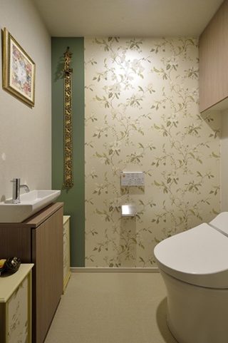 【トイレ】トイレは入り口正面の壁のみ張替。インパクト抜群の壁紙はインポートの商品。柄物と単色を張分けることで、よりデザイン性を高めています。