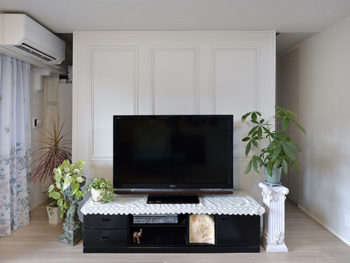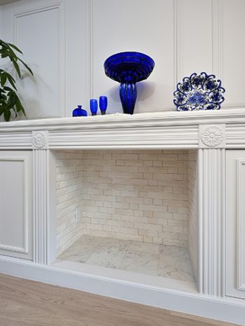 【リビング】部屋の中央にマントルピースと収納をつくり、壁面にはモールディングを取り付けることでがらっとイメージが変わり、さっぱりしたお部屋がデコラティブな空間になりました。