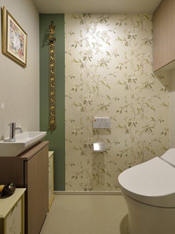 【トイレ】トイレは入り口正面の壁のみ張替。インパクト抜群の壁紙はインポートの商品。柄物と単色を張分けることで、よりデザイン性を高めています。