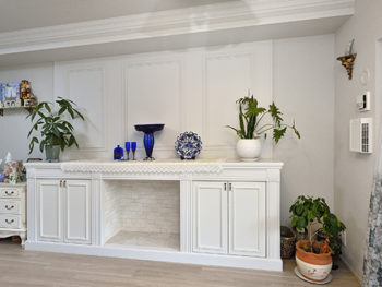 【リビング】天板・収納はあらかじめ作った家具を現場で組み込み、モールディングは現場で加工し取り付けて行きました。