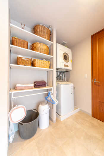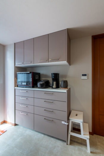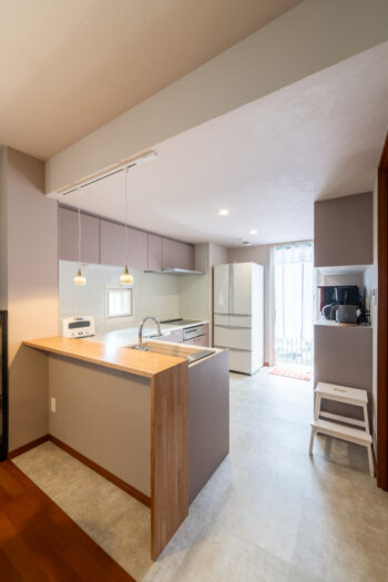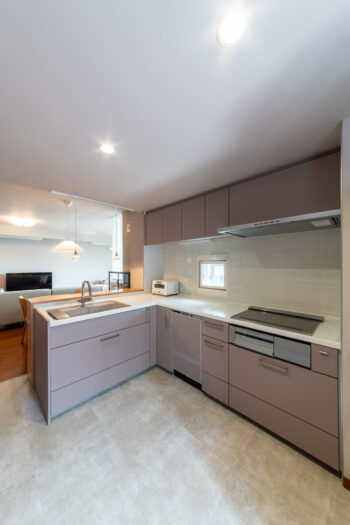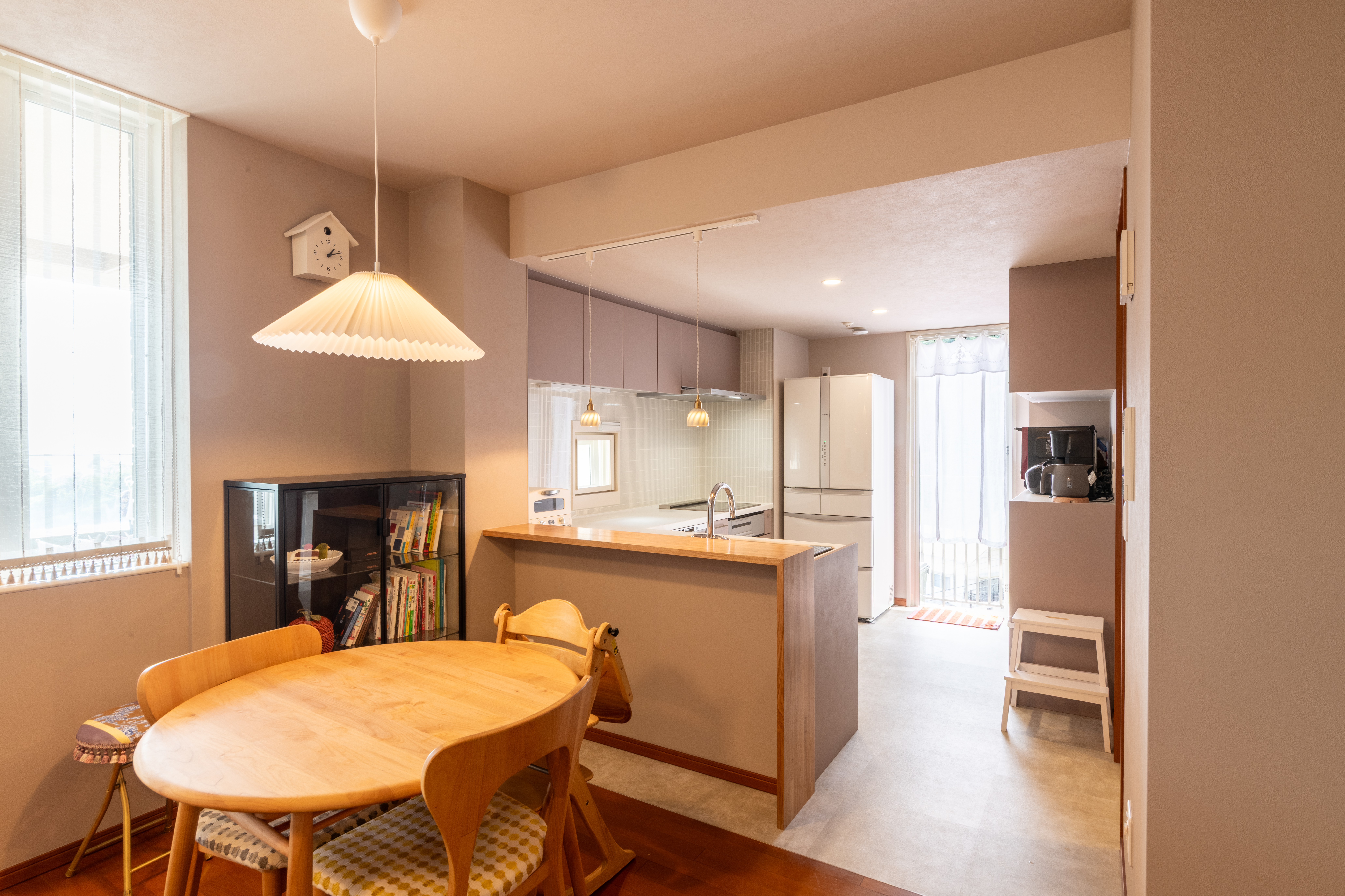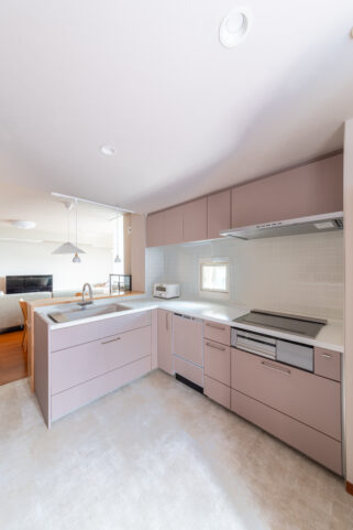 トクラスのキッチンの扉のカラーはグレイッシュなくすみカラーのピンクに一目惚れされたほど、奥様のお気に入りに。その色をベースに施主様ご家族の雰囲気に合う壁紙を選んだり、アクセントカラーで遊び心を入れながら、オリジナルな空間づくりを心がけました。施工写真の撮影時にお伺いした時に、小さなお子様がいらっしゃる中、とても綺麗に整頓されていて、ご自宅での生活を楽しみながら大切に使われているのを感じることが出来、とても嬉しく思いました。