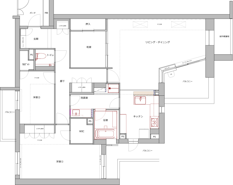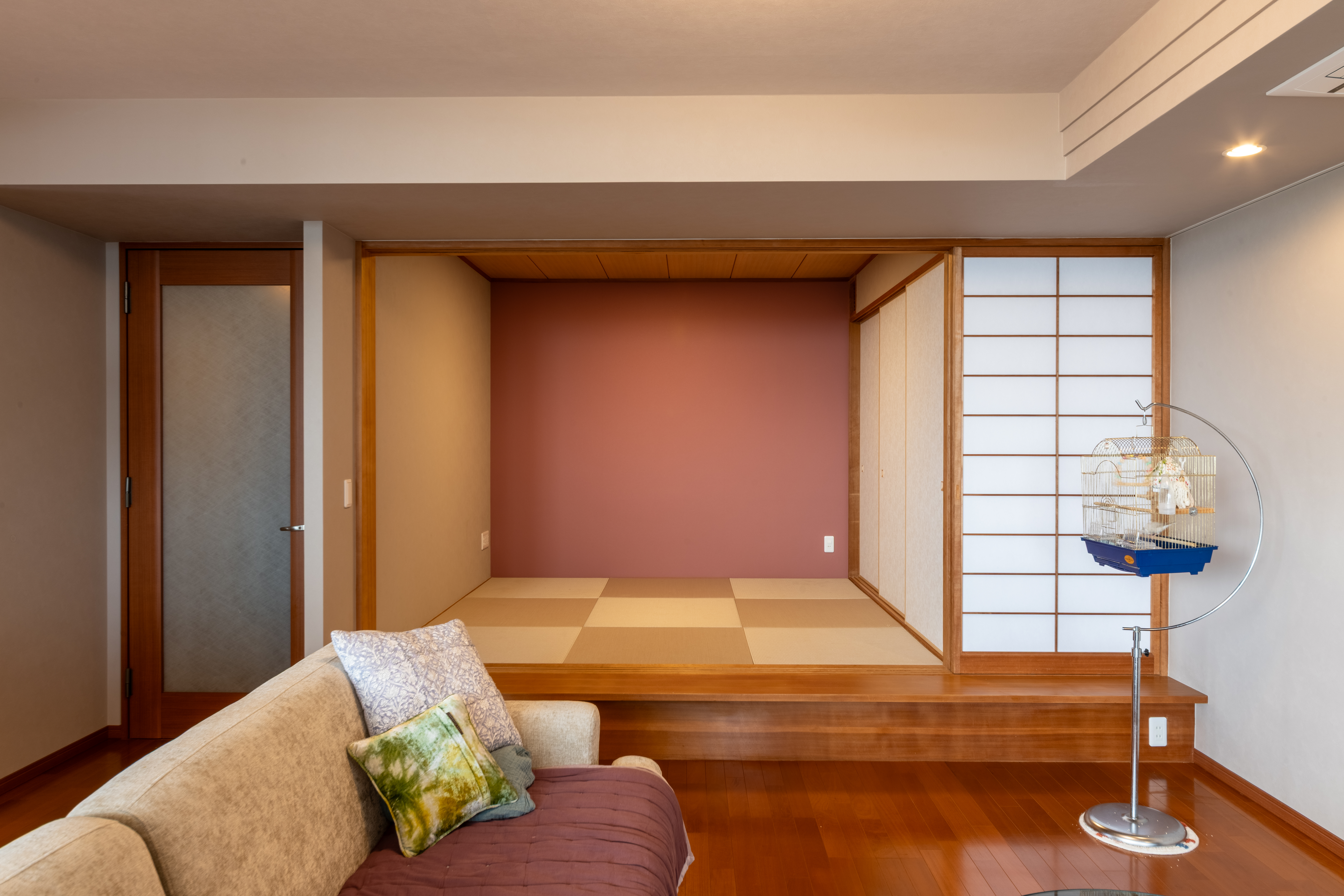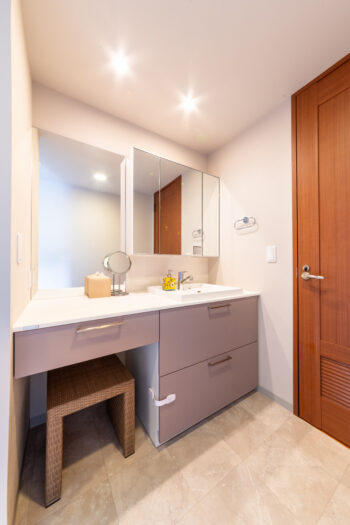 | プラン決定のポイント工夫 | ・お子様がまだ小さく、様子を見ながら家事をしたいので閉鎖的なキッチンをオープンにしたいとの事。吊り壁を撤去して、LDと一体感のある明るいキッチンを提案しました。イメージを作成して、お子様の様子を常に見ながら家事が出来るように考案していき、施主様の想いと理想にピッタリと合うようにヒアリングを重ねていきました。 ・間取りに大きな変更はなく、内装と設備入替で雰囲気を変えていきたいご要望から、奥様が一目惚れされたトクラスのキッチン(コラージア)のカラーを中心に、リビングの和室にアクセントカラーを入れてモダンな和室へと変更。整理整頓されたスッキリとしたリビングの中にオリジナリティのある洗練された空間をデザインしました。 ・トクラスの洗面台は、キッチンと同じカラーを。スモーキーピンクなカラーは、シックな中に明るさもあり、清楚で落ち着いた雰囲気を出します。オープンキャビネットを選ぶことで椅子を収納して、優雅なスキンケアタイムを過ごすことが出来るようにしています。 |
