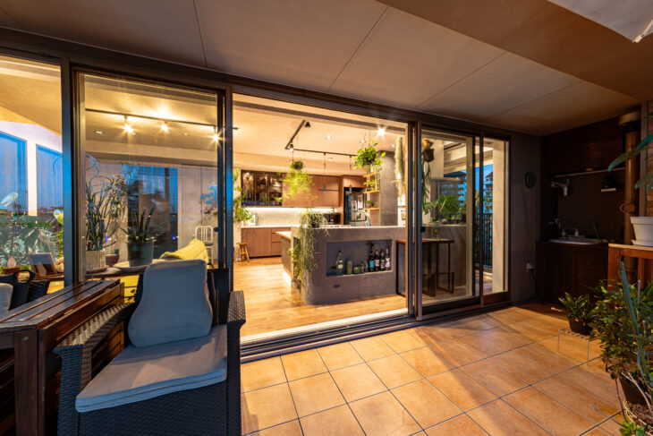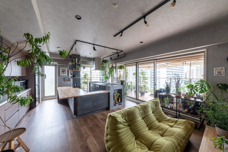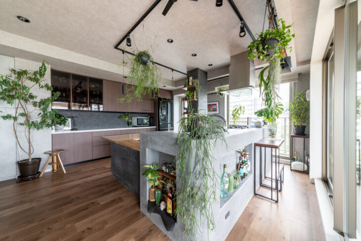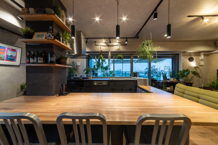 ベランダ越しに眺める外がとても気に入っているのでこの配置に大満足です。希望だったモールテックスをキッチンやダイニング、柱型に採用する事で、まるで昼はカフェ、夜は間接照明もありバーの様な雰囲気に。リノベーションしてからは友人を良く招いてパーティーをするようになりました。