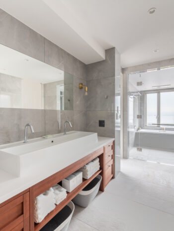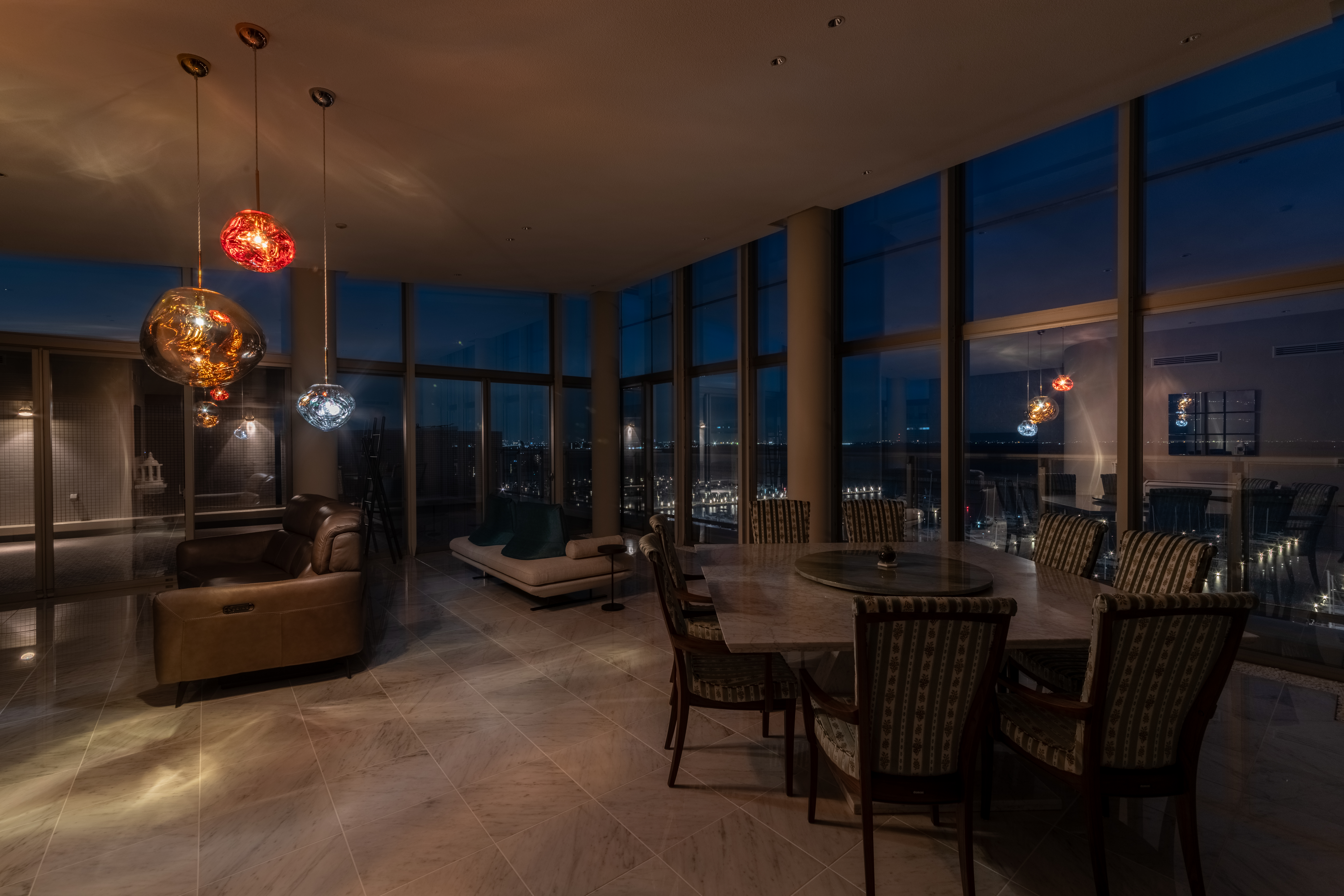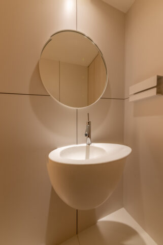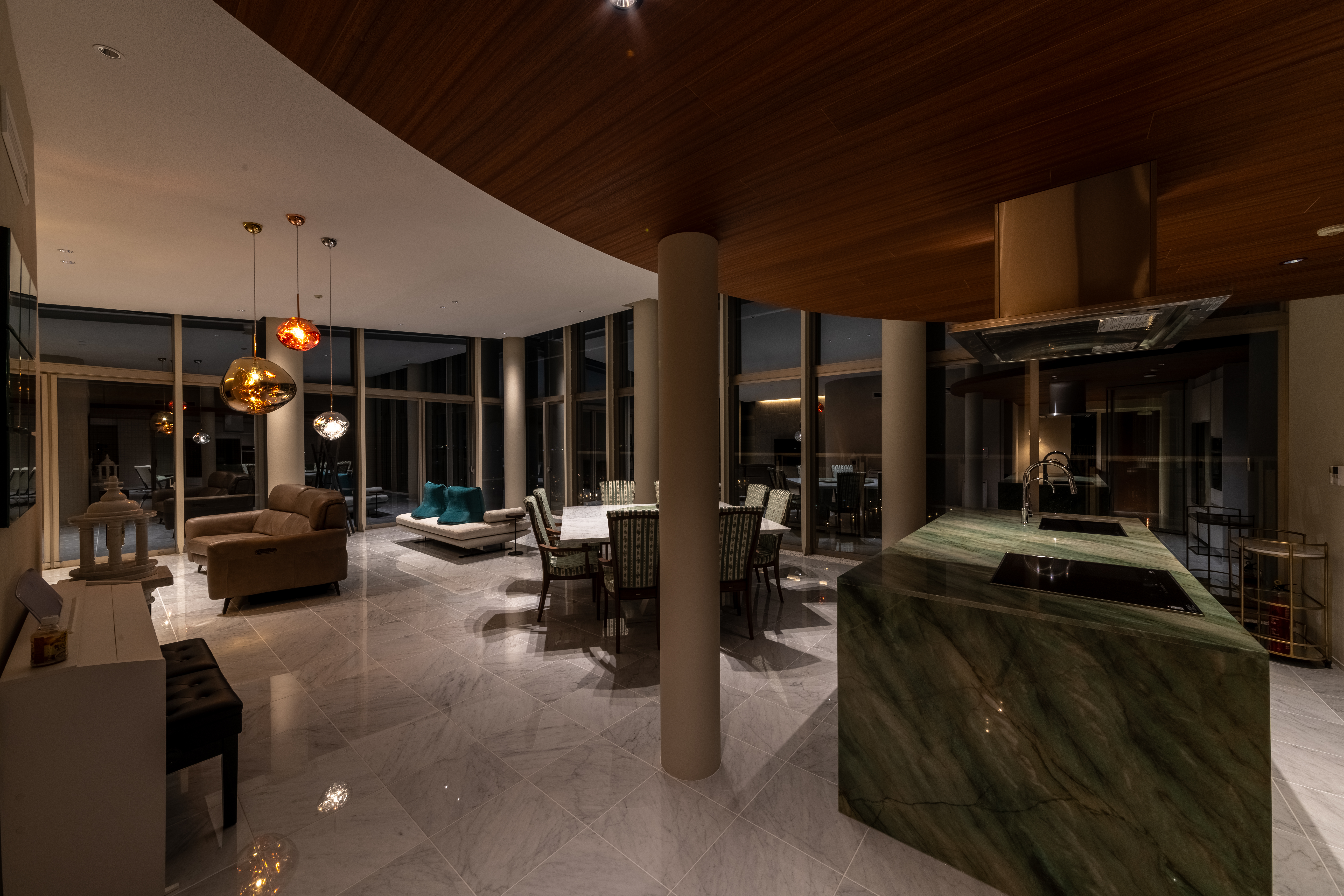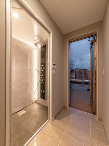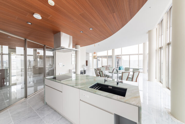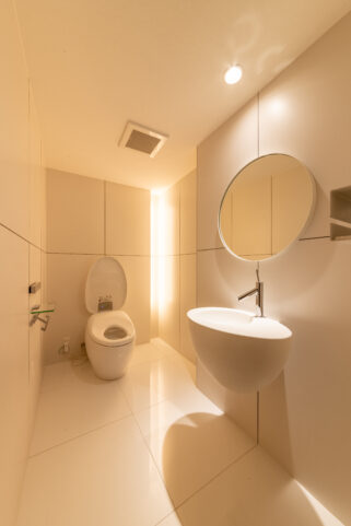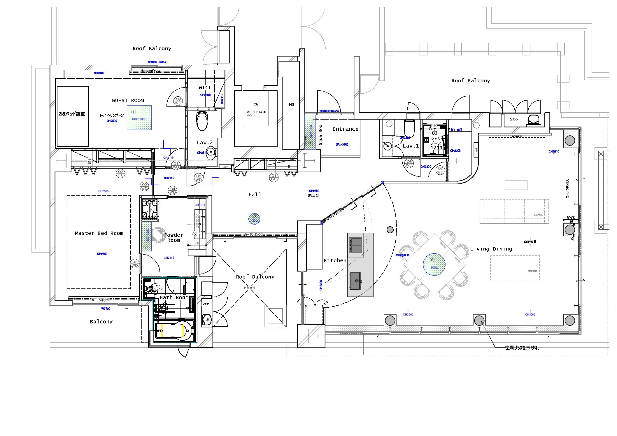 | プラン決定のポイント工夫 | ・ダイニングとリビングとの部屋の境目になる角の壁に丸みを持たせて空間の一体感を出しました。 ・リビングにある既存の柱を利用し、リビング入口の天井の高さをあえて下げて廊下の天井の高さと合わせることで、リビング全体の天井の高さを最大限に魅せることが出来、空間の一体感と広さを感じられるようにしました。全体に白を基調としたことと、低い所から、窓に向かって広がる高さと空間が、眼下に広がる海と空の青の景色を、より一層美しく楽しんで頂ける様に意識しました。 |