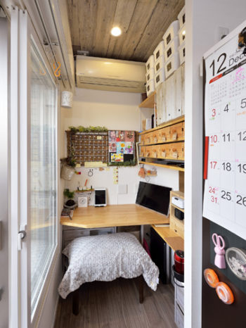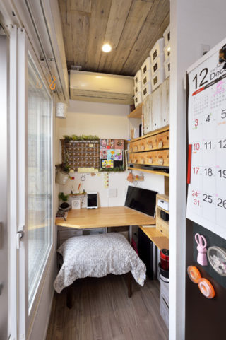 キッチンの奥の一角、カウンターを造り付けて便利な家事コーナーに。サイドの収納棚はDIYが得意なT様の手作りです。