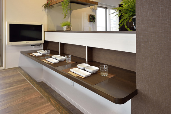 裏にあたるキッチン側調味料スペースも含め、細部にわたって細かく設計する事で、お食事もできる造作カウンタースペースが誕生しました。