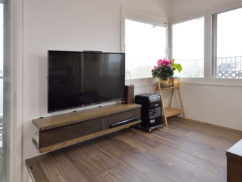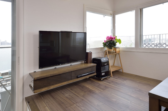 二重窓にしたおかげで、冬の寒さも和らぎ快適になりました。TV下部の棚も造作したので、サイズもバッチリです。