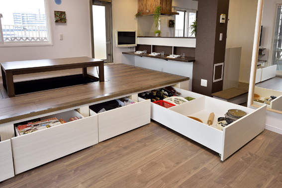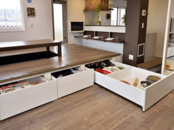 小上がりスペースの下部は、たっぷり物が入る引出収納として有効活用。