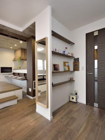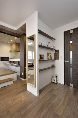 飾り棚を設けた見せる収納コーナー。裏側は新設したキッチン収納です。