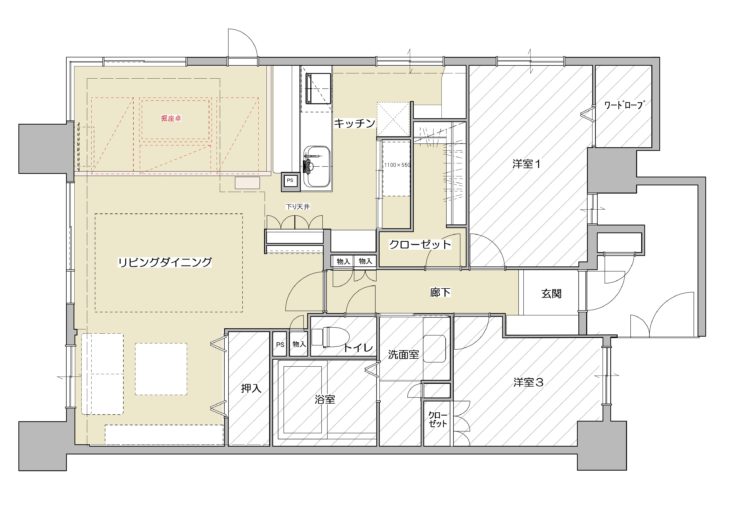 | 施工箇所 | LDK間取変更、ウォークインクローゼット、小上がりスペース |