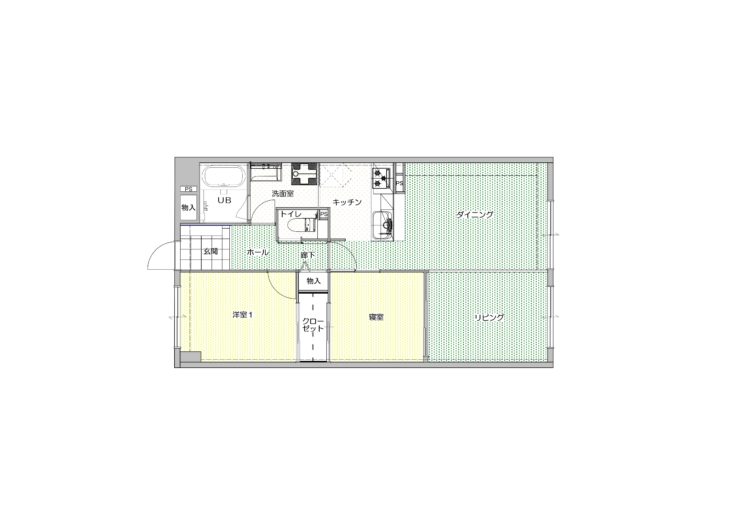 | プラン決定のポイント工夫 | リビングダイニングとの境目、キッチンの入口部分にあった段差をなくし、部分的に壁を撤去。洋室2室の間にあるクローゼットは、両サイドからアクセスでき、換気にうってつけのウォークスルー仕様にしました。 |