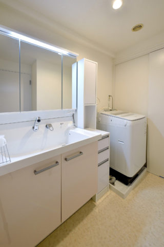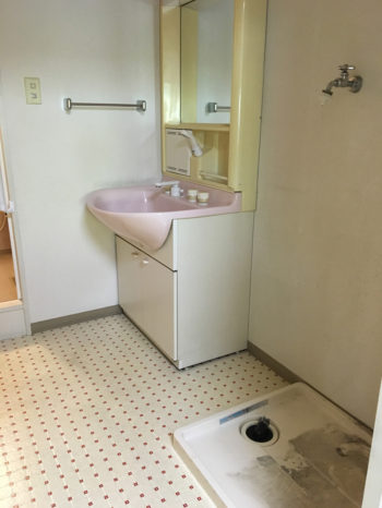 配置は同じでも、内装仕上げを新しくし、照明も取替えたことで、広々と明るく使い勝手の良い洗面室になりました。 洗面化粧台 LIXIL:ピアラ/扉柄:パウダーピンク