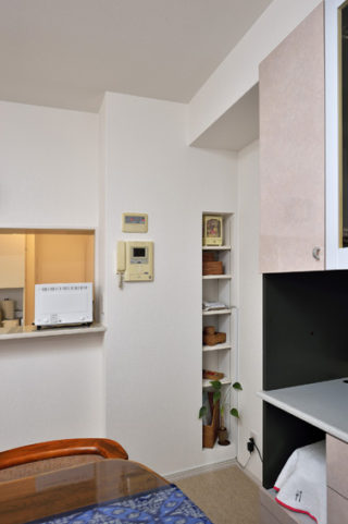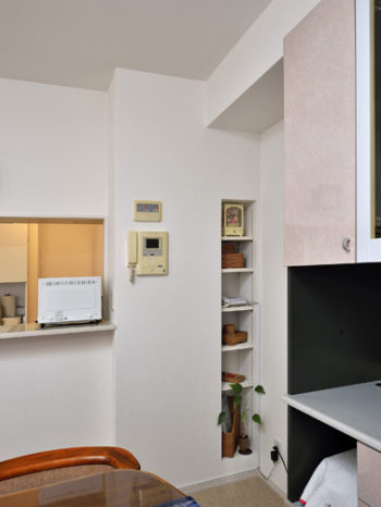 パイプスペース横のデットスペースにニッチを製作しました。電話や小物置きとして重宝されています。