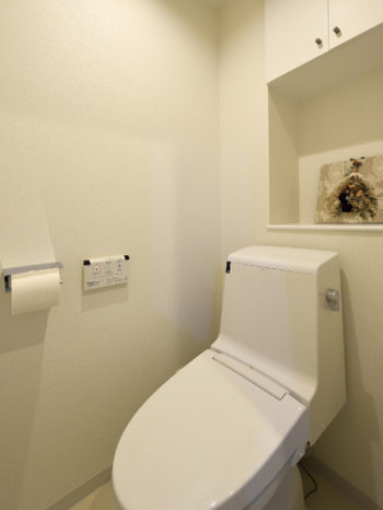手洗いなしのタンク式トイレへ取替えました。お手入れのしやすいフチなし形状が、毎日のお掃除を楽にしてくれます。トイレ:LIXIL/アメージュ