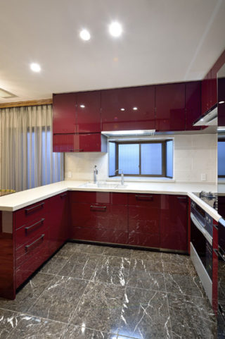 【キッチン】キッチン:Lクラス/Panasonic 床タイル:ゴールデンブラウン/NITTAI 壁タイル:ミラストリーム マーブルホワイト柄/KYタイル