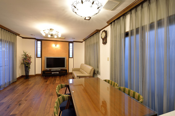 【LD】カーテンはあえてレースのみとし、軽やかさを演出。床材は無垢のフローリングを採用しました。 レース:メタリクス/マナトレーディング フローリング:3層フローリング床暖房対応 ウォルナットナチュラル(節有)/オスモ