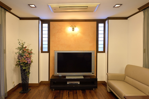 【LD】壁は漆喰塗り、正面TV後ろの壁はアクセント色を採用し、リビングの中心としての存在感ある壁面となりました。