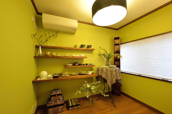 【アトリエ】姉妹のアトリエとしてお使いのお部屋。向かって左がお姉さんの趣味のお皿や器を飾るスペースとして使用しています。段違いの飾り棚はオーク突板のクリア塗装。