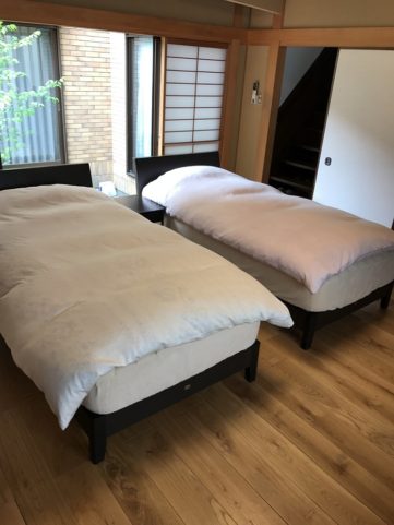 【1階和室→洋室】1階の和室を洋室に変え、畳からフローリングに。ベッドを置くことで布団の上げ下げをしなくてすむ様になりました。 フローリング:無垢オークフローリング/オスモ
