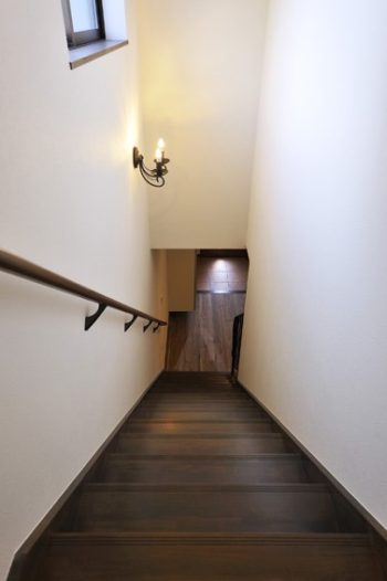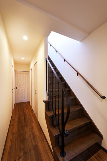 【階段】壁は、コストやメンテナンスのことを考え、塗影ではなくペイント風の風合いが施された機能性壁紙に。
