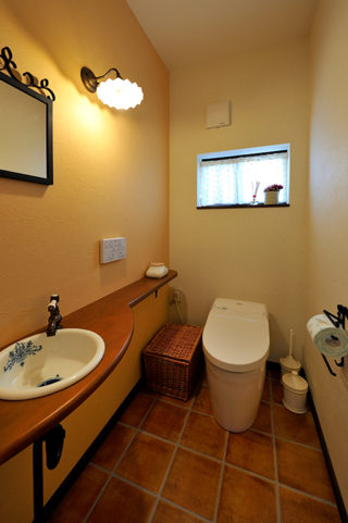 【3階トイレ】手洗いのデザインにこだわり、輸入ボウルと水栓を採用。塗り壁風の壁紙とフロアタイルであたたかみのある空間に。
