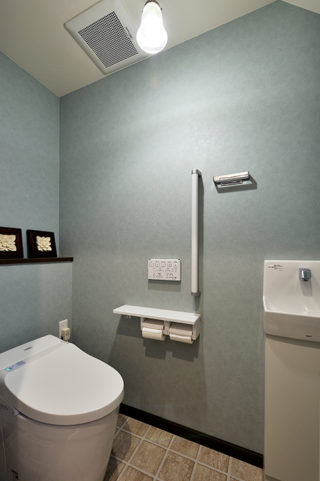 【2階トイレ】自動水栓の手洗いや、手すりも備えた機能的な空間に。
