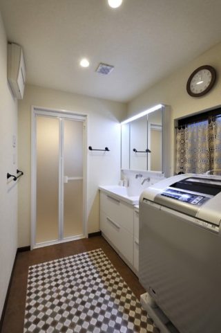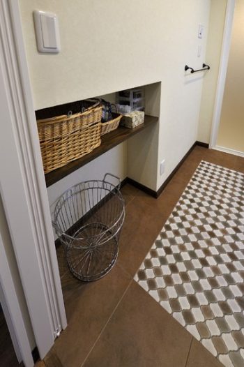 【洗面室】置場に困る脱衣かごも、凹みを作ってしっかり確保。