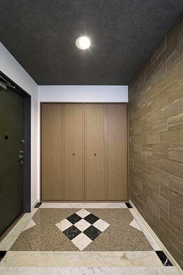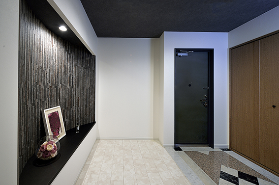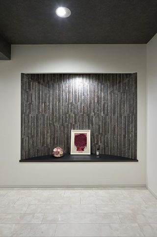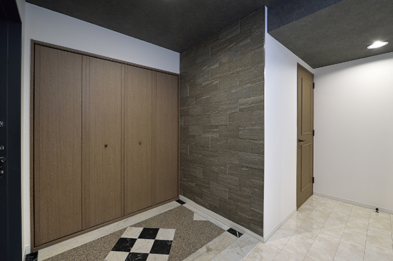 既存の玄関床タイルに合わせてコーディネトした壁面タイル。