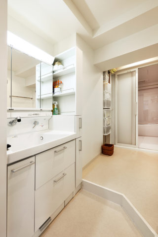 床段差の位置を洗面化粧台の奥にして、普段の生活での不便が減るよう工夫しました。