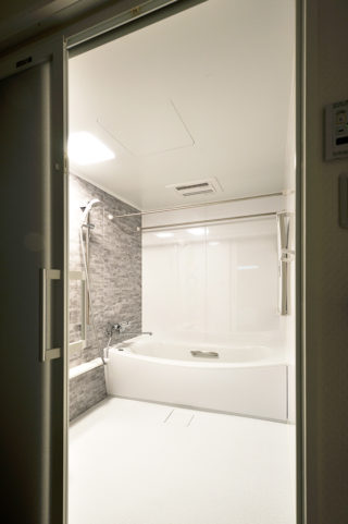 洗面化粧室とフラットにつなぎ、大きく開口できる3枚引き戸を採用するなど、安全性と快適性を追求しています。