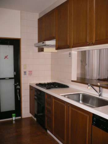 【キッチン】吊戸やキッチン横の袖壁があるため、少し閉鎖的な空間でした。