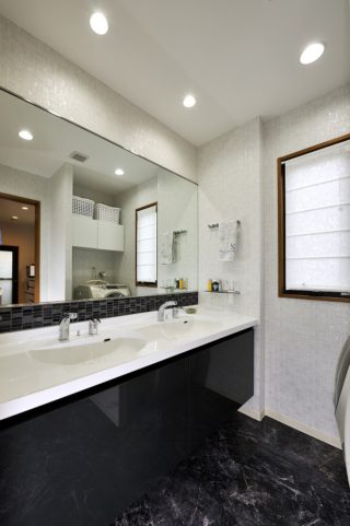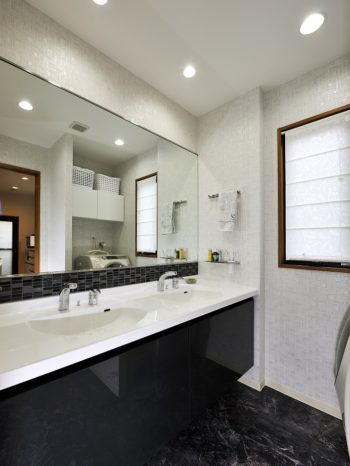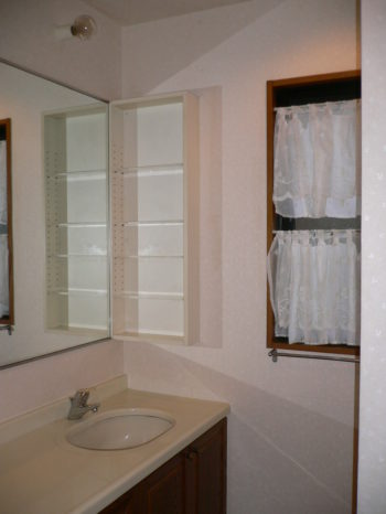 【洗面室】元々は廊下からの出入り口でしたが、その部分に大容量の収納を。何かと物が多い洗面室なので、収納量を重視した間取りに。