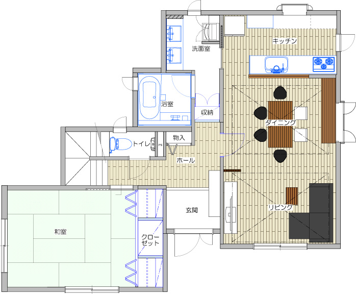床材の色をとても悩みましたが、ご提案のフローリングにして正解でした!リビングが生活の中心となっています。デザイン性もよく機能的な設備機器で新しい生活のスタートです。