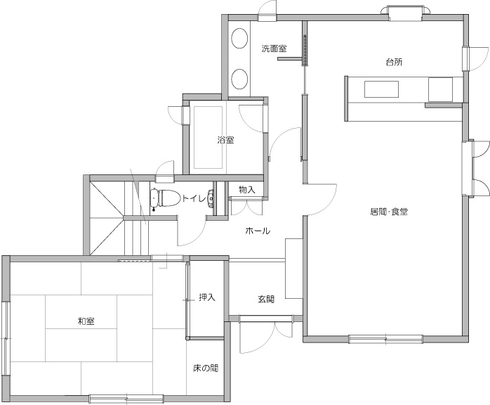 | お客様のご要望 | 中古物件購入にあたり2世帯住宅にリフォームをご検討。水廻り設備の取替・内装・床暖房の設置。 |