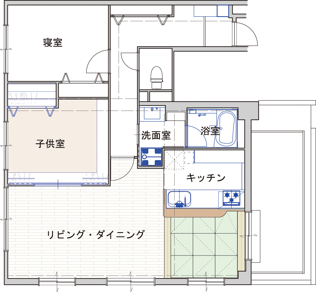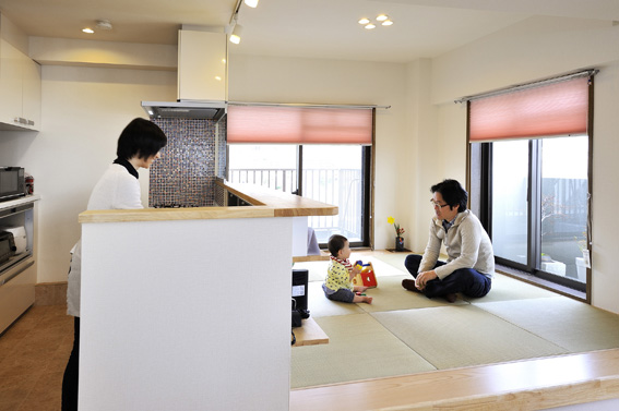 【リビング・キッチン】小上がりは家族団らんの場所になりました。
