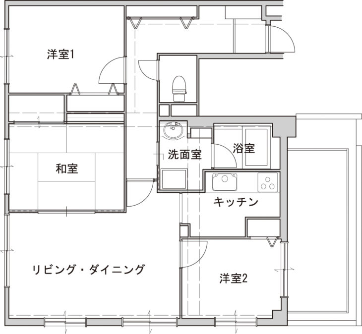 【リビング・キッチン】LDKと洋室の壁を取り、一体の空間に。