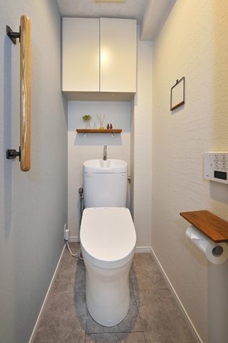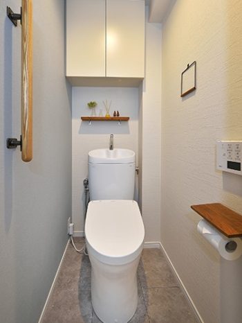 【トイレ】同じ広さのトイレでもすっきりと広く感じられる様に、壁の一部にアクセントクロスを貼り、視線を逃がす工夫を。