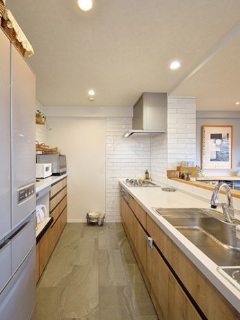 【キッチン】パイプスペース廻りやキッチン背面の収納部分にもこだわりのタイルを。